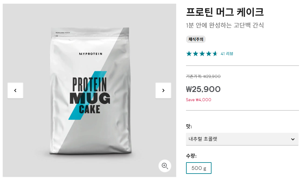 저는 주로 마이프로틴 홈페이지에서 구매합니다. 다양한 할인 프로모션을 매번 진행하고 있죠. 최근에는 25,900원에 500g씩 판매하고 있네요. 맛은 내추럴 초콜렛과 솔티드 카라멜 두 종류입니다. 마이프로틴 프로틴 머그 케이크는 1인분(50g)에 단백질이 34g이나 들어있을 정도로 단백질 함량이 높습니다. 하루에 100g 이상의 단백질 섭취를 목표로 하는 저에게는 고마운 존재네요. 영양성분 표를 보시고 참고하시기 바랍니다.