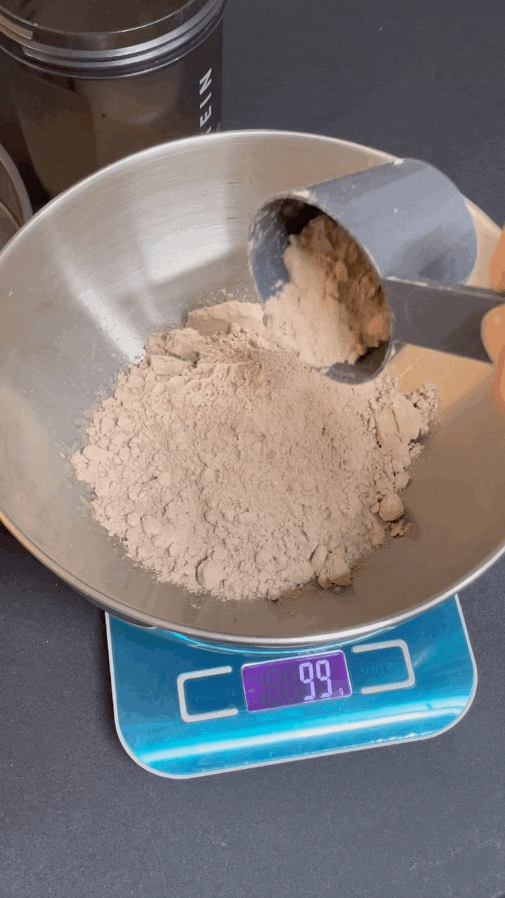보울에 머그 케이크 믹스를 담아 계량합니다. 계량 스푼과 저울로 100g을 맞춰줍니다. 100g의 양이 꽤 많아 보이네요. 마이프로틴에서 프로틴을 구매할 때 동봉되는 계량스푼을 사용했습니다. 한 스쿱에 25g 정도 떠지는 양이에요.