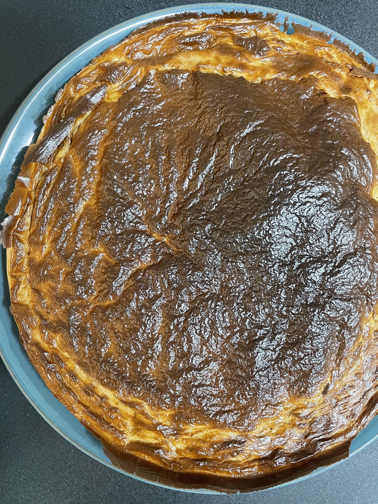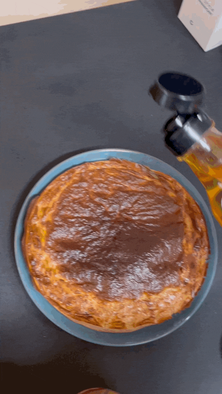 5분 더 돌려서 총 15분을 구워주니 팬케이크가 더 구릿빛으로 영롱해지면서 먹음직스러운 자태를 뽐내고 있었습니다. 약간 바스크치즈케이크 같기도 했어요. 속도 다 익은 것을 확인했고 그릇으로 옮겨주었습니다.