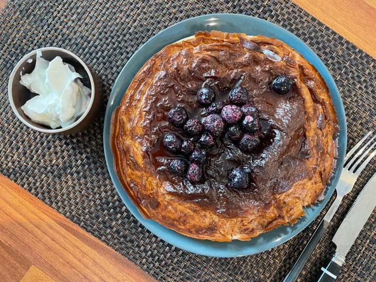블루베리를 토핑으로 고명처럼 올려주고, 미리 만들어둔 홈메이드 그릭 요거트를 생크림 대체로 곁들여 먹었습니다. 남편과 함께 반 씩 나누어 먹으니 맛도 있고 포만감도 있고 성취감도 있었습니다. 직접 만든 건강한 빵을 만드니 뿌듯하고 기분이 좋더군요. 원하는 토핑을 올려 커스텀 할 수도 있구요.