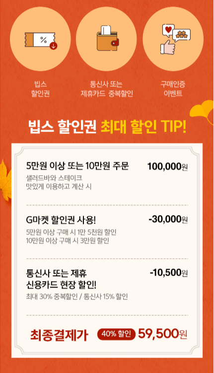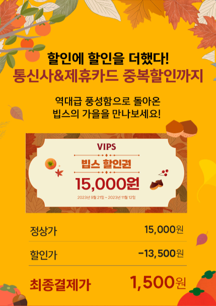 빕스는 시즌마다 엄청난 할인율의 할인권을 고객들에게 제공하고는 합니다. 지난 5월, 봄 시즌 메뉴를 빕스 할인권으로 저렴하게 샐러드바를 이용했던 포스팅을 했었는데요, 이번에는 가을 시즌을 맞아 빕스에서 할인권을 판매하고 있어 공유하고자 합니다. 글 하단에 빕스 100원에 결제하는 꿀팁에 관한 내용도 포함되어 있으니 잘 살펴보시고 합리적 소비자 되시길 바랍니다. :)