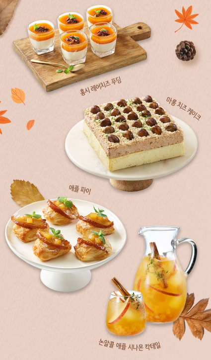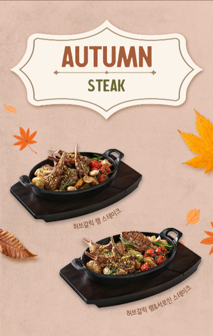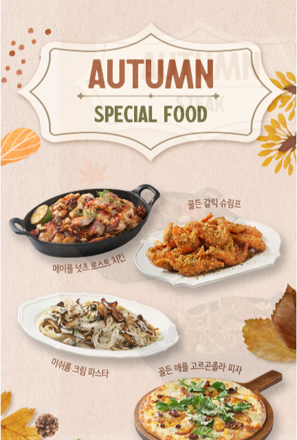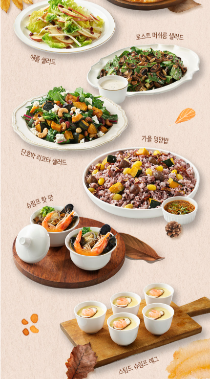 이에 더하여 메이플 넛츠 로스트 치킨, 골든 갈릭 슈림프, 머쉬룸 크림 파스타, 골든 애플 고르곤졸라 피자, 애플 샐러드, 로스트 머쉬룸 샐러드, 단호박 리코타 샐러드, 가을 영양밥, 슈림프 핫 팟, 스팀드 슈림프 에그가 스페셜 푸드로 준비되어 있네요. 벌써부터 입에 군침이 돕니다.