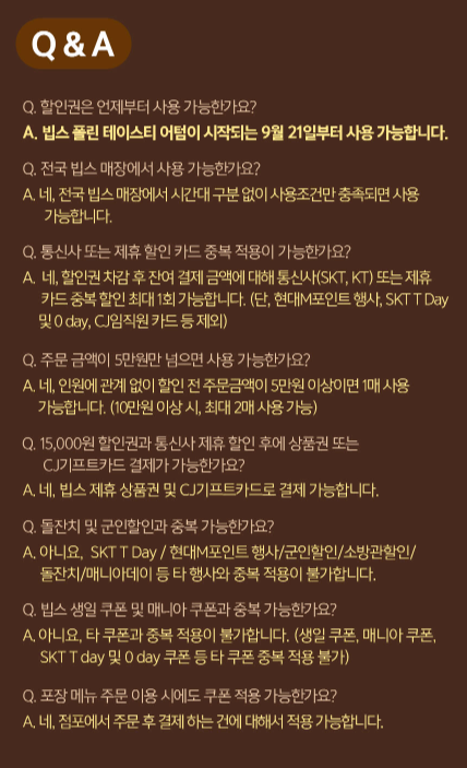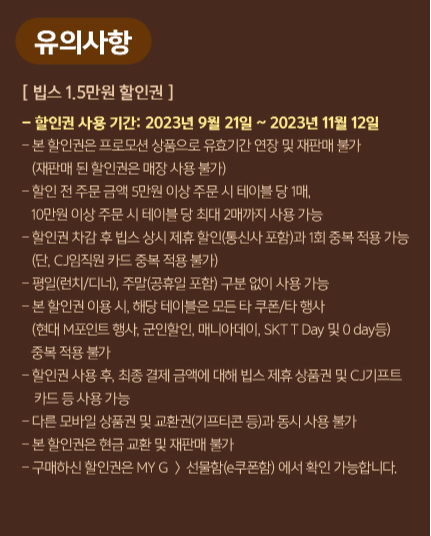 할인권에 더하여 통신사 및 제휴카드 중복할인까지 할 수 있어서 정말 저렴하게 샐러드바를 이용할 수 있는 기회입니다. 저는 이 할인권 판매를 할 때마다 꼭 사두고 남편과 함께 빕스털이를 하러 간답니다. ㅎㅎ 이번 할인권 사용 기간은 2023년 9월 21일부터 11월 12일까지 약 한 달 반 간의 기간 동안 사용할 수 있네요. 기간 잊지 마시고 꼭 챙기시길 바랍니다.