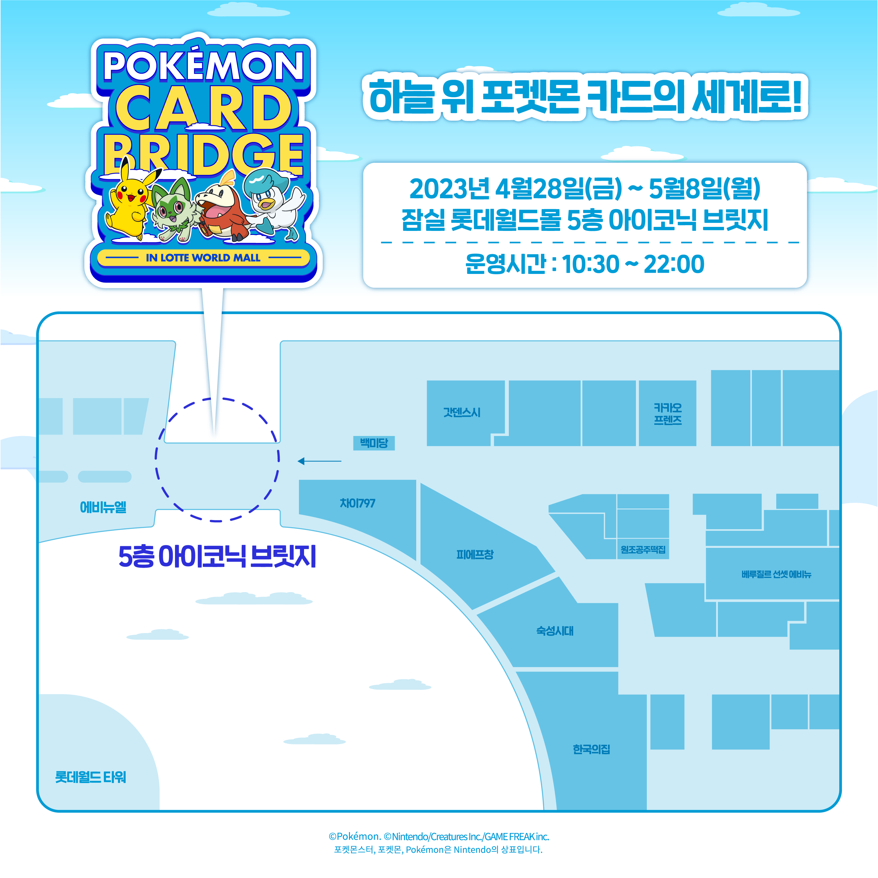 포켓몬스터 스칼렛*바이올렛 게임에 등장하는 캐릭터들과 함께하는 배틀 체험도 준비되어 있다고 합니다. 또한 게임 체험 이벤트로 처음 접하는 사람들도 누구나 자유롭게 플레이 가능하다고 하네요. 4층 키즈플로어에서 진행된다고 하니 참고 바랍니다. 배틀 체험 이벤트는 체험 기간이 정해져있으니 확인하시고 방문하시기 바랍니다.
