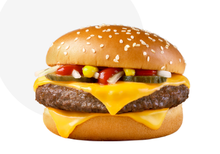 쿼터파운더라는 이름에서 알 수 있듯이 두 배 이상 커진 약 113g의 비프와 부드러운 치즈 두 장의 환상 궁합을 맛 볼 수 있는 버거입니다. 두툼한 순 쇠고기 패티와 신선한 치즈의 풍부한 맛으로 세계적으로 사랑받고 있는 대표적인 맥도날드의 버거인데요, 빵과 쿼터파운더 패티 외에도 피클, 치즈, 생양파, 토마토케첩이 햄버거 안에 들어갑니다. 치즈 버거와 다른 점은 커팅 생양파를 쓴다는 점을 꼽을 수 있겠네요. 이 버거는 517kcal, 단백질 32g입니다. 그러나 지방량이 조금 높은 편이라 지방을 신경쓰시는 분들은 조심하셔야 하겠습니다.