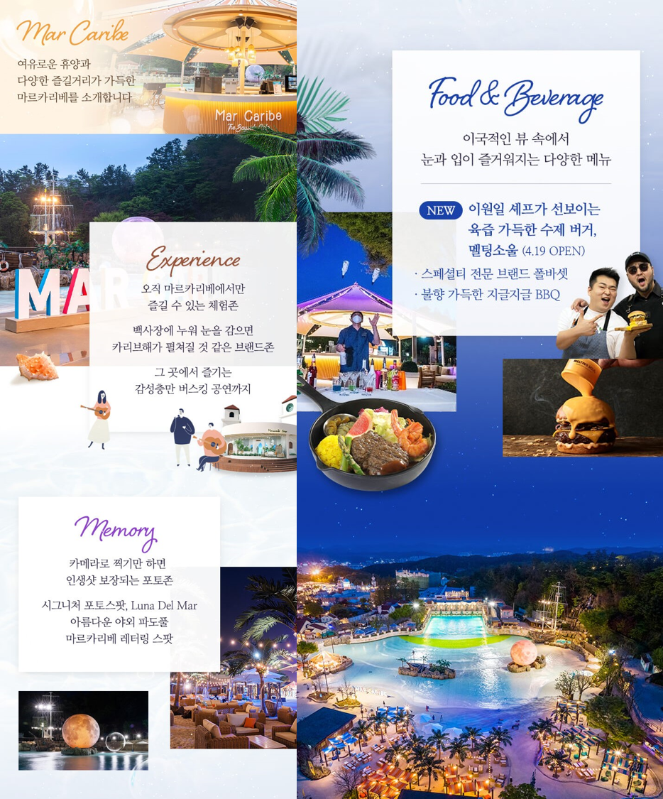 마르카리베는 야외 파도풀 지역에 해외 휴양지 컨셉으로 조성된 공간인데요, 이용객은 별도 요금 없이 캐리비안베이를 입장할 수 있습니다. 야자수 아래 쉐이드존에 해먹, 빈백, 행잉체어 등 약 260석 규모의 좌석이 마련돼 있어 휴식을 취할 수도 있고, 비치사이드바와 레스토랑 등에서 다양한 종류의 먹거리도 제공합니다. 수제버거 브랜드 '멜팅소울'과 콜라보한 이색 먹거리도 만나볼 수 있다니 기대가 되네요.