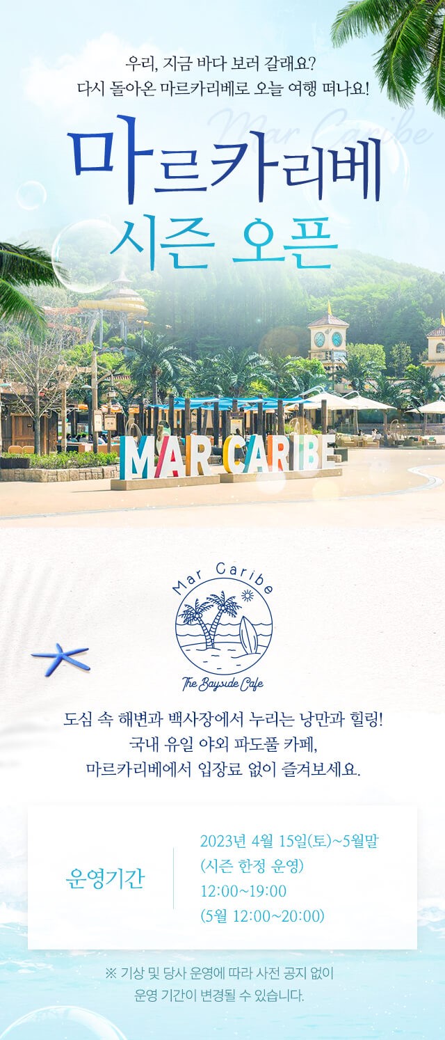 에버랜드는 개장 47주년과 올해 입장객 100만명 조기 돌파를 기념하여 캐리비안베이 '마르카리베'를 오는 4월 15일 (토)부터 5월 21일 (일)까지 무료 개방합니다. 이번 프로모션은 야외 나들이 수요가 증가하는 봄 시즌을 겨냥했는데요, 정부가 지난달 발표한 내수 활성화 대책에 동참하는 차원으로 해석됩니다.