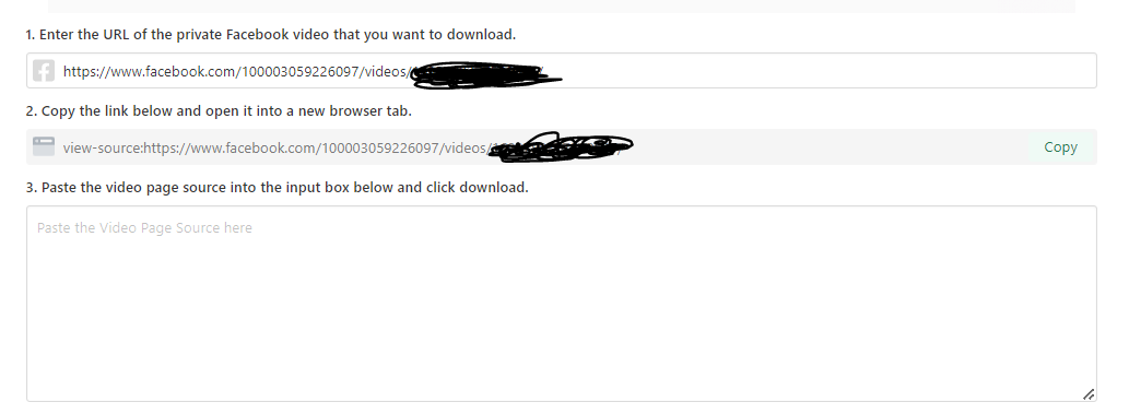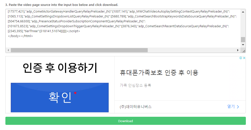 다시 아까 fsave 페이지로 돌아옵니다. 3번의 'save the video page source here'라고 적혀있는 공란에 아까 복사했던 주소들을 붙여넣기 해줍니다.