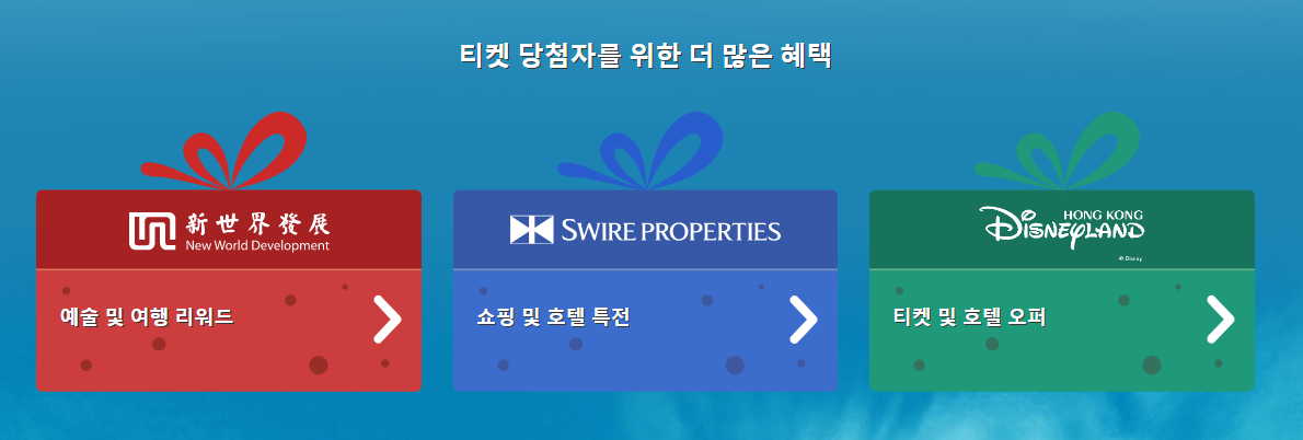 여기에다 당첨자에게는 홍콩에서의 숙박과 쇼핑, 엔터테인먼트 등을 즐길 수 있는 별도 혜택도 제공된다고 하니 홍콩 여행에 관심 있던 분들은 믿져야 본전인 마음으로 신청해보셔도 좋을 것 같습니다.