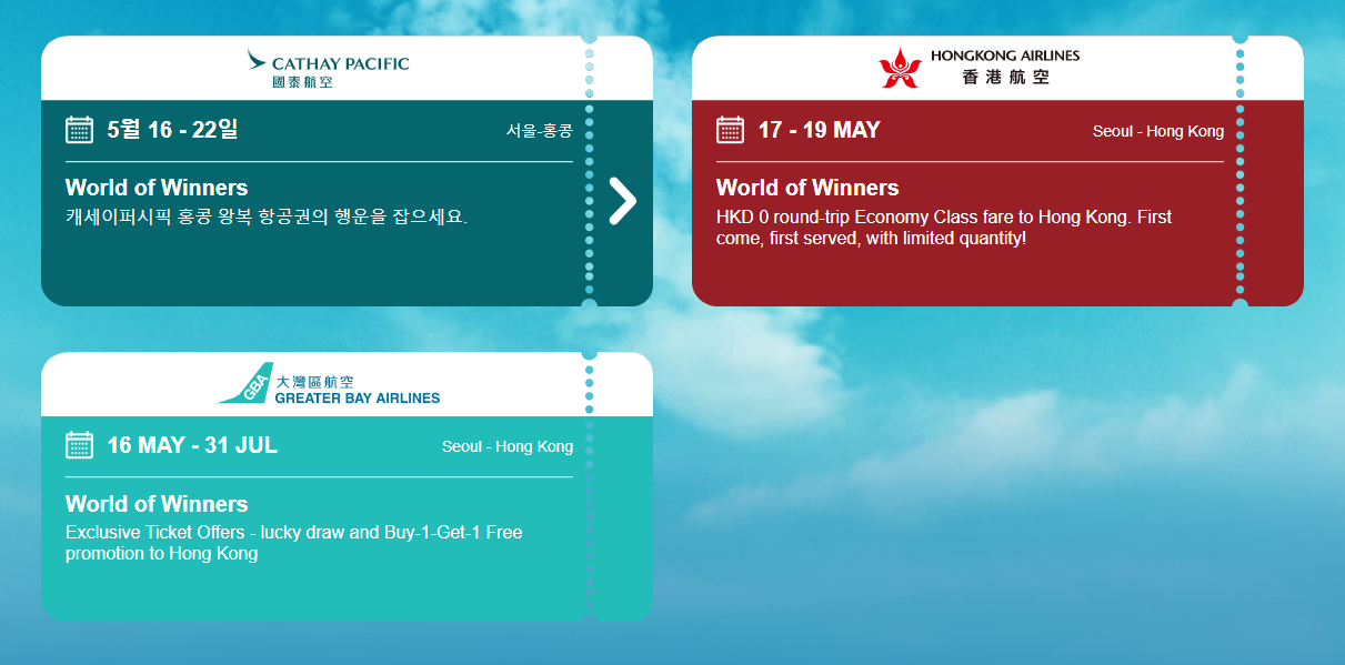 홍콩공항관리국 측에 따르면 이번 행사는 전 세계 여행객이 홍콩을 방문할 수 있도록 홍콩행 무료 왕복 티켓 50만 장을 제공하는 '월드 오브 위너스(World of Winners)' 캠페인의 일환이라고 합니다. 전체 50만 장 가운데 75%인 약 37만 5,000장이 아시아 지역에 배정 되었고, 그 중 한국에 배정된 2만 4,000여 장은 전체 4.8% 규모이니 상당하다고 보여집니다. 홍콩은 이 글로벌 캠페인에 약 20억 홍콩 달러(약 3,400억 원)을 투자했다고 합니다. 홍콩 경제의 17%를 책임지던 관광업이 코로나 사태로 직격탄을 맞자 홍콩 정부와 항공사 네 곳이 합심하여 관광객 유치에 사활을 걸었다고 합니다. 한국에서는 서울과 제주, 부산에서 출발하는 이코노미 클래스 왕복 항공권을 아래 항공사들이 지급합니다. 해당 홈페이지 회원 가입이 반드시 필요하니 신청하실 분들은 미리미리 가입해두시는 것이 좋겠습니다. 오는 16일부터 홍콩국제공항 인터넷 홈페이지 또는 해당 항공사 지정 웹페이지를 통해 신청을 받아 '무료 티켓'이나 '1+1' 방식으로 배포하는데, 세금과 유류할증료만 내면 왕복 항공권을 받을 수 있습니다. 평소 이들 항공사의 홍콩 왕복 티켓 값은 1인당 약 45만 원 정도이니 역대급 혜택이 아닐 수 없네요.