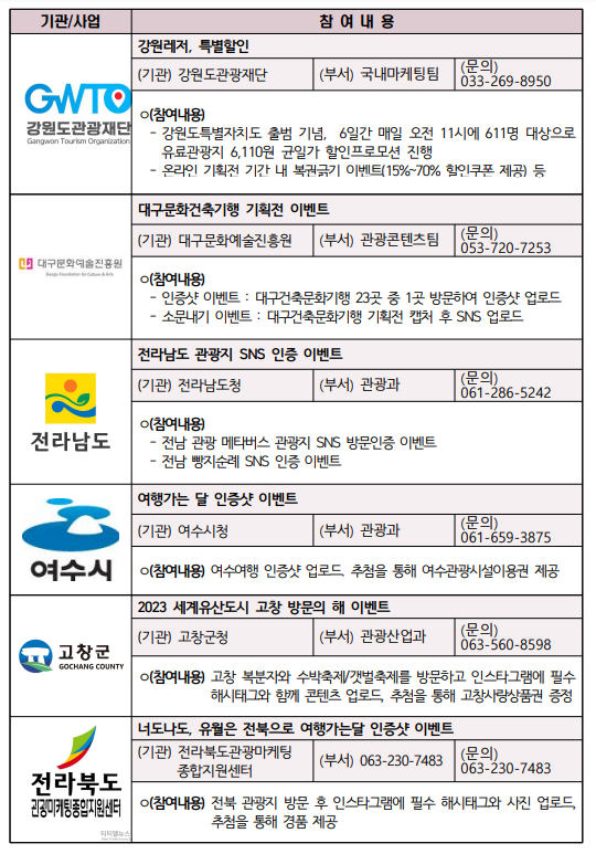 문화체육관광부와 한국관광공사가 6월 1일부터 30일까지 '2023년 여행가는 달'로 추진한다고 17일 밝혔습니다. 올해 대한민국 구석구석 여행으로 나만의 여행 버킷리스트를 완성하고, 영화처럼 멋진 여행의 주인공이 되자는 의미를 담아 '대한민국은 절찬 여행 중'이라는 주제로 진행될 예정입니다.
