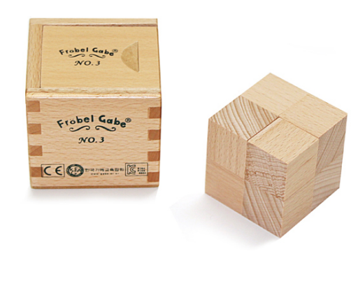 1가베는 아동의 자발적인 행동을 유발하고, 이어 2가베가 공간적 형태의 다양성으로 끌고 갔다면, 3가베는 통일성과 다양성이 존재하고 이를 통해 유아의 사고력, 상상력, 수 개념, 미적 감정 등을 양성하며 자기 활동을 활발히 하게 합니다. 이로써 창작 활동을 자유롭게 발전시키고 감정을 미화 시킬 수 있게 되는 것이죠. 3가베의 새로운 특징은 여러 가지 건축물을 만들면서 놀 수 있다는 것입니다. 2가베에서 형태의 성질을 알게 된 아이들은 사물의 겉모양에 만족하지 않고, 차츰 사물의 내부까지도 알고자 하는 욕구가 생기게 되고, 또 다양한 표현을 위해 복잡한 재료를 찾게 됩니다. 프뢰벨은 이와 같이 아이들에게 스스로 간단히 분리하면서 자연스럽게 표현 할 수 있고, 또 원래의 형태로 조립하기도 하고 늘어놓기도 할 수 있는 구체적인 교구가 필요하다고 생각했고, 2가베의 분리를 통한 3가베를 고안하게 된 것입니다.
