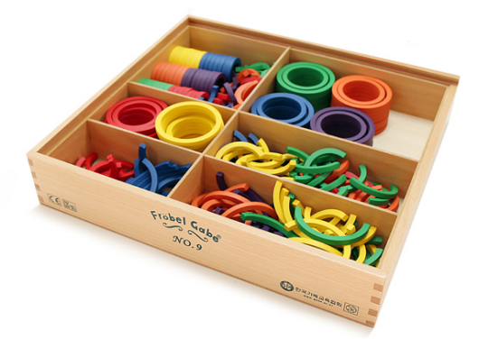 8가베에서 직선을 경험해 보았다면, 9가베는 사물의 성질을 보다 구체적으로 나타내주는 곡선으로 만들어져 있습니다. 곡선은 구부러진 선을 말하는 것으로, 동적이면서 자유로운 선으로 이루어진 여러 가지 곡선이 있습니다. 곡선은 전혀 새로운 것이 아니고, 이미 1가베의 공, 2가베의 구와 원기둥에서 유아들이 경험하게 됩니다. 지금까지는 간접적으로 경험한 것을 9가베에서는 구체적인 고리로 만들어 직접적으로 경험할 수 있도록 합니다. 6가지 색깔의 2.5cm, 3.75cm, 5cm의 세가지 크기의 고리와 고리를 반으로 나눈 3가지 크기의 반고리로 모두 6가지로 구성되어 있습니다. 이 세 가지 크기의 고리와 반고리를 사용하여 직선으로 표현하기 힘들었던 동물과 사물들을 사실적으로 표현함으로써 미적 창작력을 양성하고 곡선의 미를 알게 됩니다. 또한 원목으로 만들어져 차가운 쇠의 느낌보다 더 따뜻한 느낌을 줌으로써 아이들의 정서 발달에 있어서도 적합한 교구라고 할 수 있습니다. 곡선은 동적이고도 자유로운 선이므로, 이렇게 한정된 곡선 이외에도 여러 가지 곡선이 있기 마련이지만, 프뢰벨은 아이들이 이미 경험한 것을 토대로 새로운 교구를 소개해 나가는 교육적 방침에 따라서, 1가베와 2가베의 곡선을 기초로 하여 9가베에 이르도록 한 것입니다.